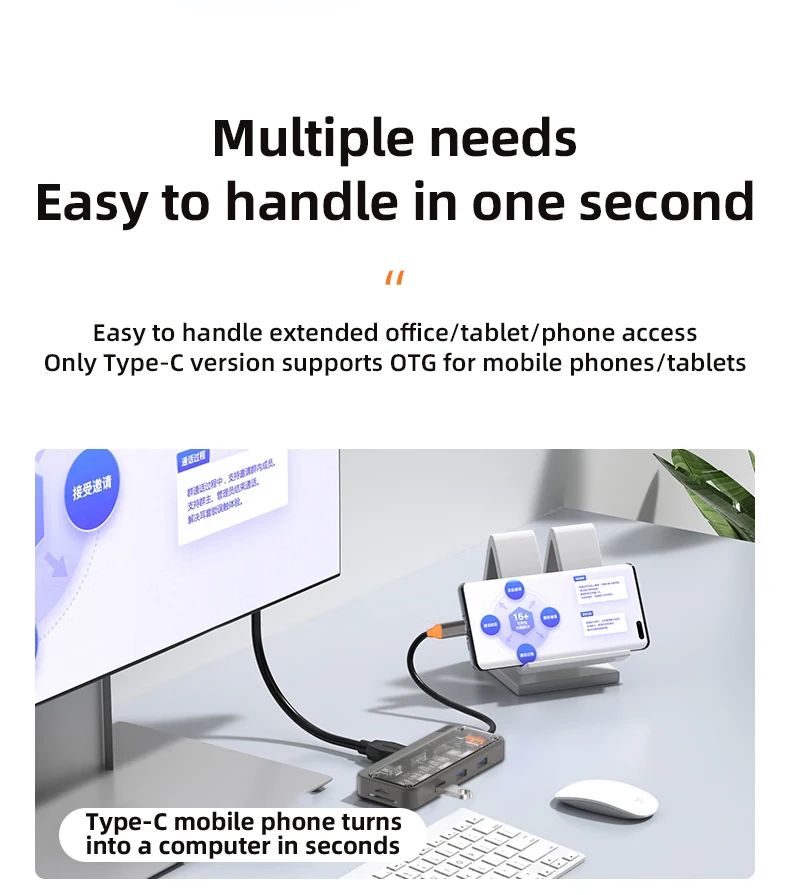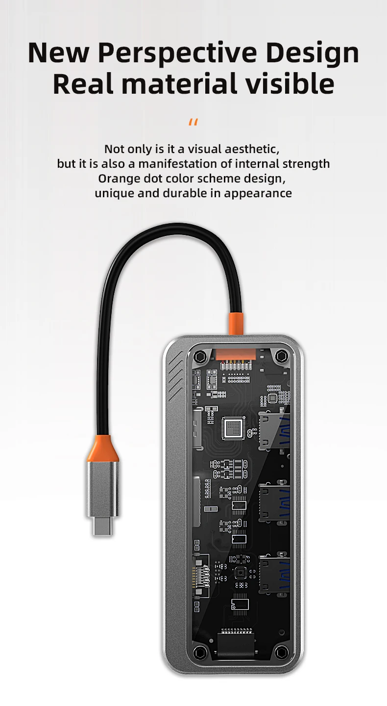 WFYEAR Factory Direct 10 Port Transparent Design RJ45 1000M Interface Charging Hub With Card Reader 4K HD USB-C Pad Hub
